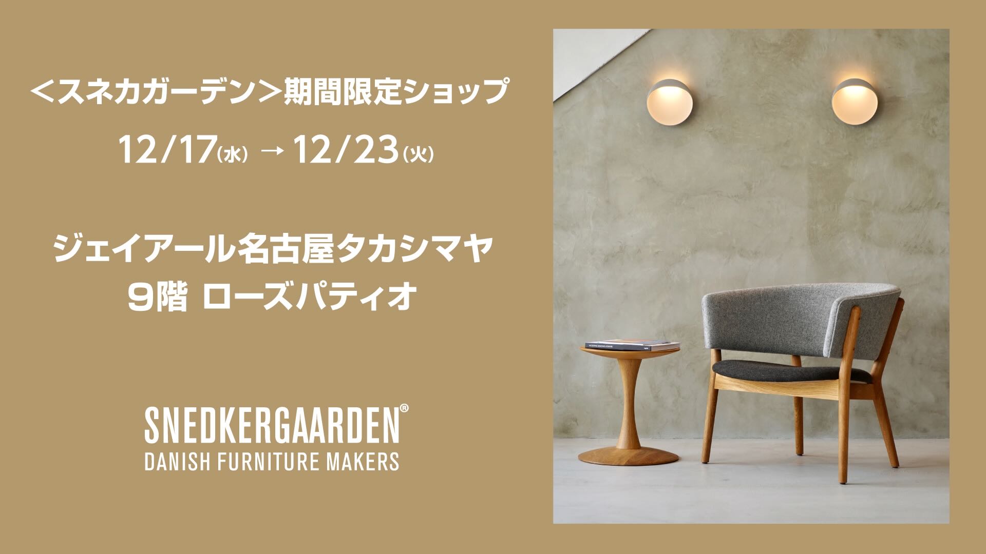 株式会社モノクラシック(本社:愛知県豊橋市、代表取締役:杉浦公治、以下「弊社」)は、昨年より日本総輸入販売元として展開するデンマークの家具メーカー「Snedkergaarden(以下、スネカガーデン)」の期間限定ショップをジェイアール名古屋タカシマヤにて出店する運びとなりました。